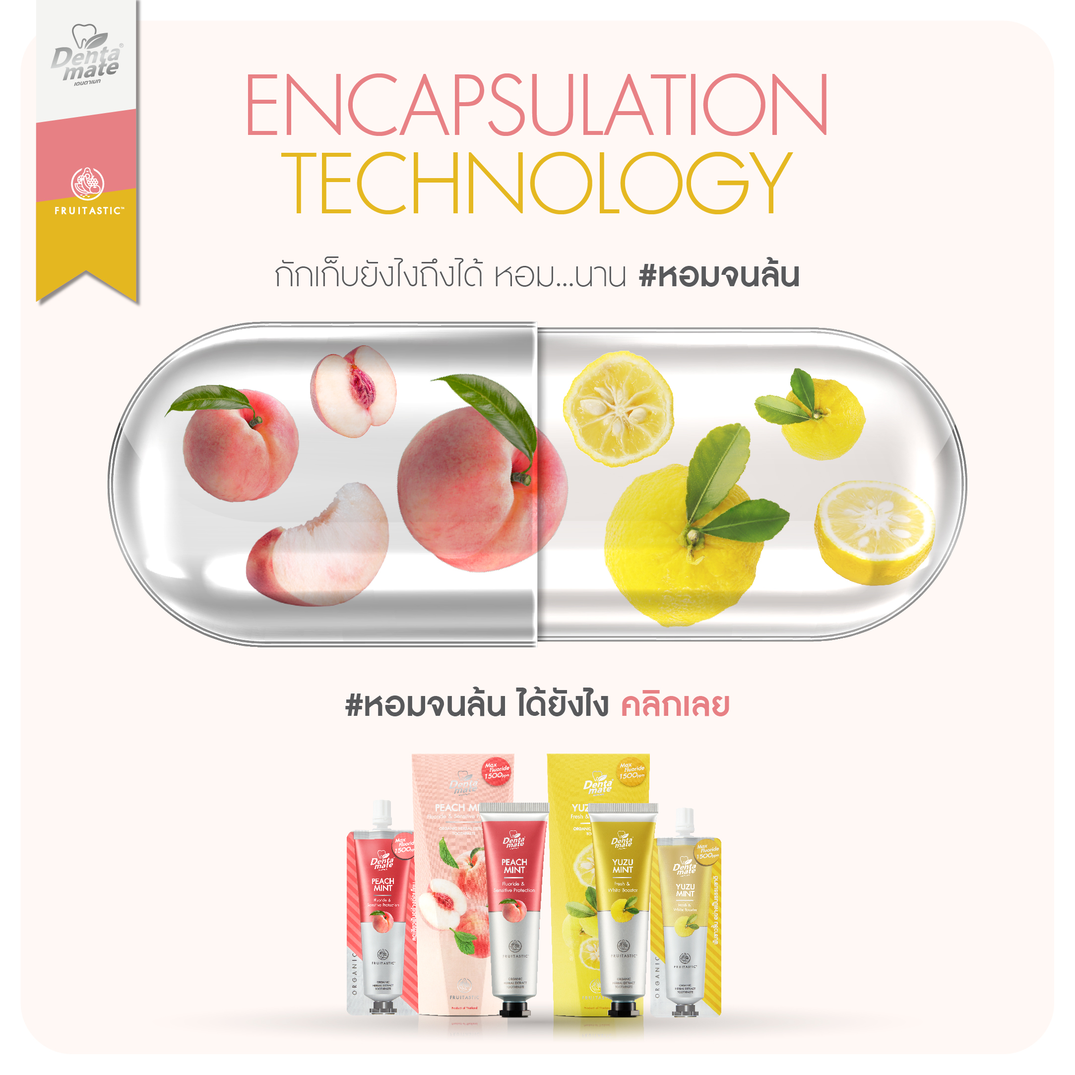 ซึ่ง Dentamate นำเทคโนโลยี Nano Encapsulation ที่กักเก็บความหอมมาใช้กับยาสีฟัน เดนตาเมท สูตร Peach Mint & Yuzu Mint ช่วยให้สัมผัสถึงความหอมสดชื่นได้ยาวนาน