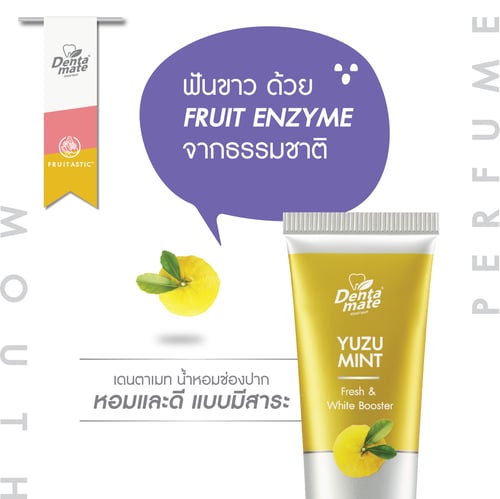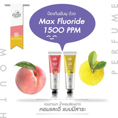 Dentamate Peach Mint & Yuzu Mint ยาสีฟันที่มีการใช้เทคโนโลยีกักเก็บความหอม และ ความเย็นสดชื่นเป็นพิเศษด้วย Encapsulated cool mint Technology เพื่อให้ลมหายใจหอมสดชื่นยาวนาน มีส่วนผสม Premium Organic จากธรรมชาติและ Micro Silica ช่วยขจัดคราบ ทำความสะอาดฟันได้อย่างอ่อนโยน พร้อมทั้งมี Max Fluoride 1500 ppm ป้องกันฟันผุ