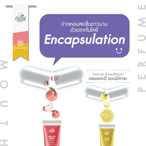 สูตรพีชมินต์ ยูซุมินต์ ใช้เทคโนโลยี Nano Encapsulation ที่กักเก็บความหอมมาใช้กับยาสีฟัน เดนตาเมท สูตร Peach Mint & Yuzu Mint ช่วยให้สัมผัสถึงความหอมสดชื่นได้ยาวนาน