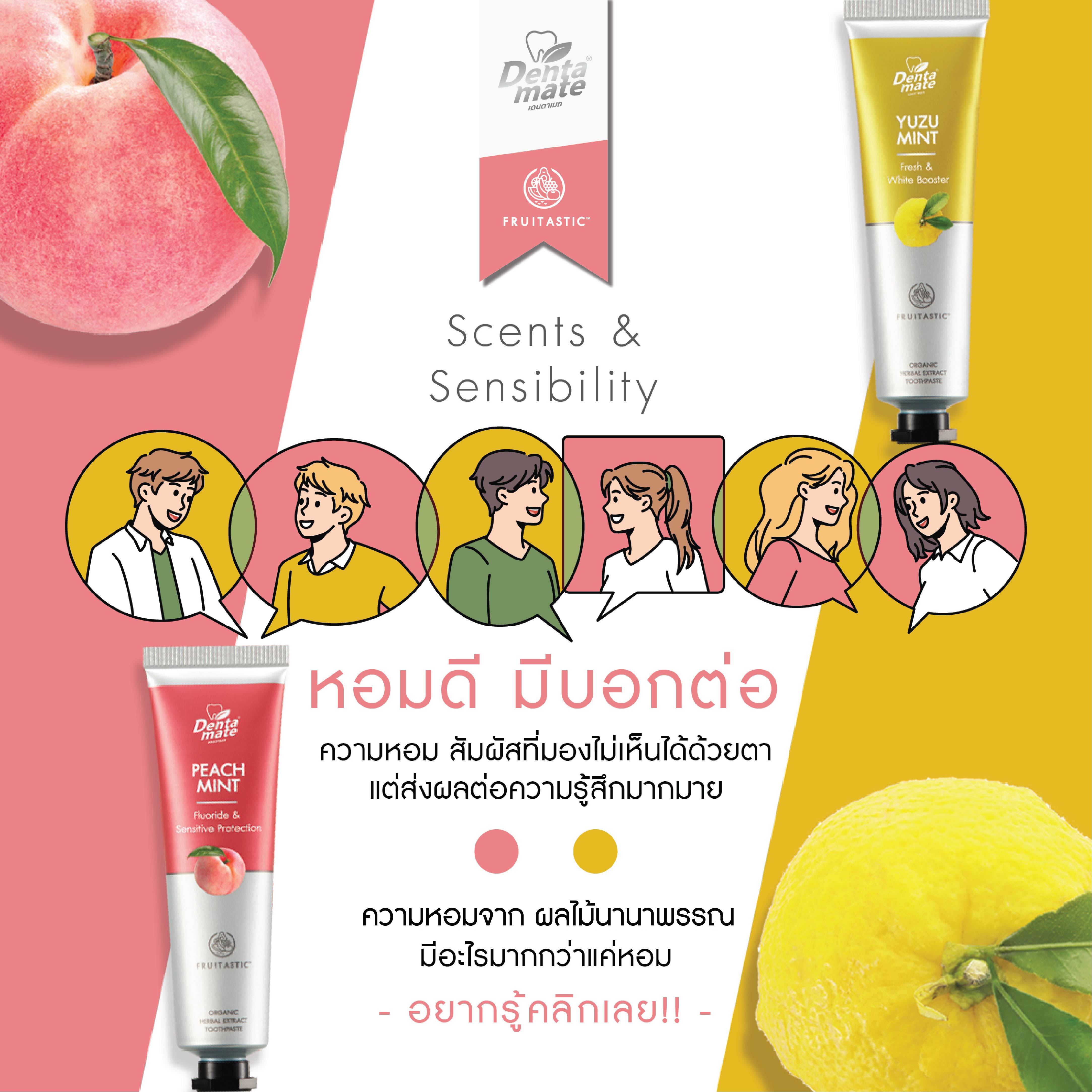 เดนตาเมท จึงได้เลือกนำ กลิ่นพีช และ กลิ่นส้มยูซุ มาเป็นกลิ่นของยาสีฟัน ซึ่งจะช่วยให้มีความสดชื่น รู้สึกกระปรี้กระเปร่า และช่วยให้ผ่อนคลายจากกลิ่นหอมของยาสีฟันในขณะที่แปรงฟันเช่นเดียวกัน