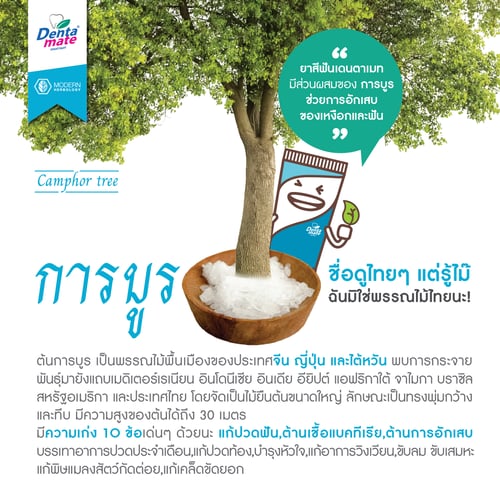จึงถูกนำมาใช้เป็นส่วนผสมในยาสีฟัน เพื่อช่วยบำรุงรักษาเส้นประสาทฟัน และมีส่วนช่วยให้เหงือกรัดกระชับ แข็งแรง หมดปัญหาเหงือกร่น นอกจากนี้ กลิ่นหอมของการบูรยังช่วยเพิ่มความสดชื่นในช่องปาก ทำให้รู้สึกสะอาด เย็นสดชื่นตลอดวัน ซึ่งมีอยู่ใน เดนตาเมท ยาสีฟันสมุนไพรสกัดเข้มข้น ทั้ง สูตรเฟรชมินต์ และ เฮอร์เบิลมินต์ ทำให้คุณได้รู้สึก โล่ง...สบายปาก ตั้งแต่วินาทีแรกที่ได้ลอง