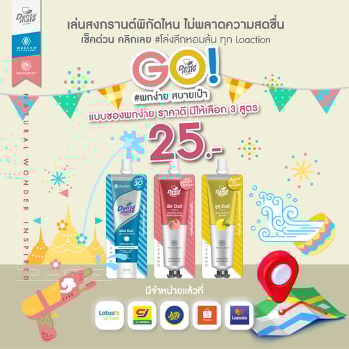 เพื่อเพิ่มความมั่นใจตลอดทริป อย่าลืมพก Dentamate แบบซองพกง่าย แบนราบไปกับกระเป๋า พกไปไหนก็สะดวก แถมมีให้เลือกหลายสูตร