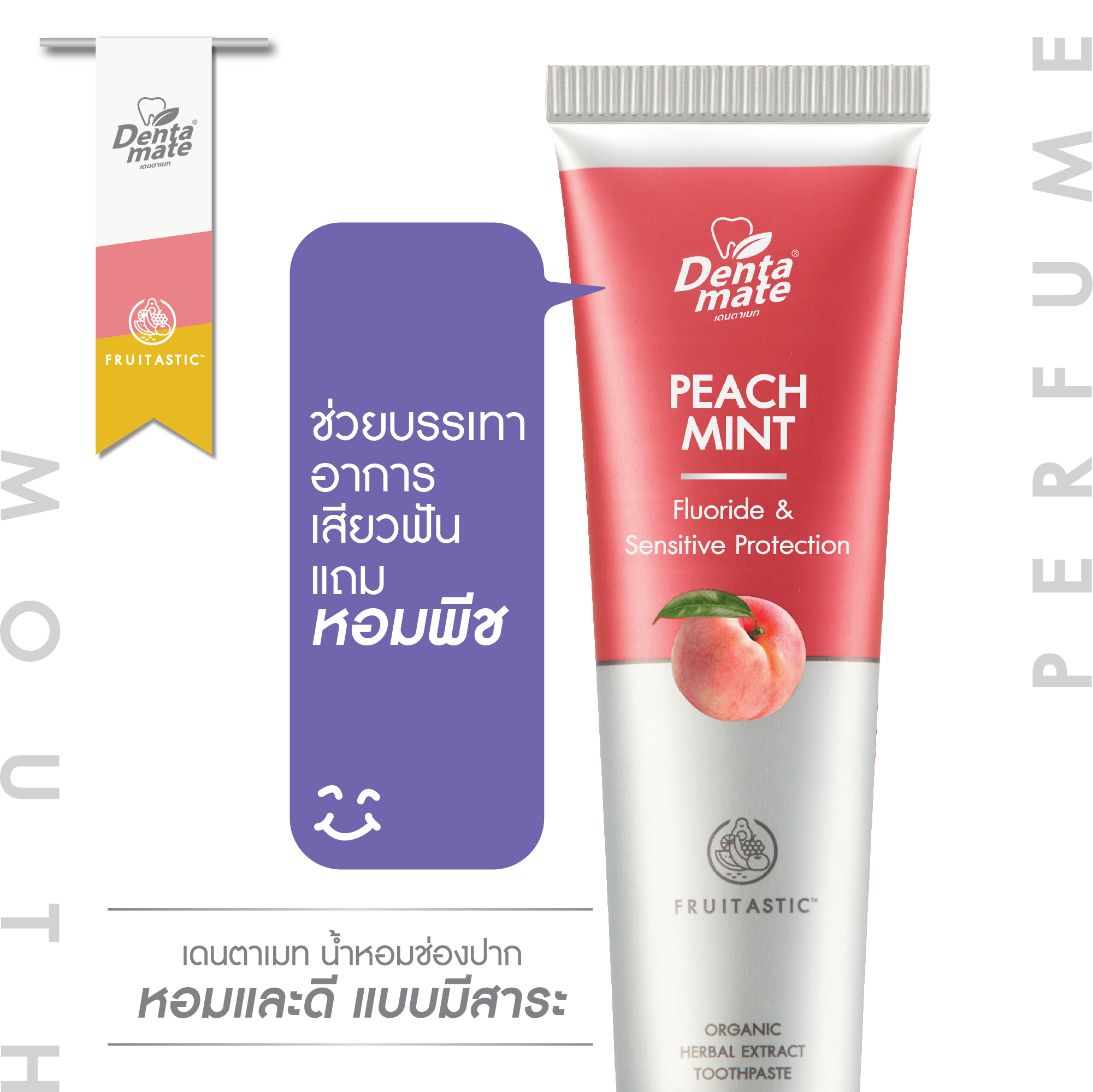 Dentamate Peach Mint  & Yuzu Mint ยาสีฟันที่มีการใช้เทคโนโลยีกักเก็บความหอม และ ความเย็นสดชื่นเป็นพิเศษด้วย Encapsulated cool mint Technology เพื่อให้ลมหายใจหอมสดชื่นยาวนาน มีส่วนผสม Premium Organic จากธรรมชาติและ Micro Silica ช่วยขจัดคราบ ทำความสะอาดฟันได้อย่างอ่อนโยน พร้อมทั้งมี Max Fluoride 1500 ppm ป้องกันฟันผุ