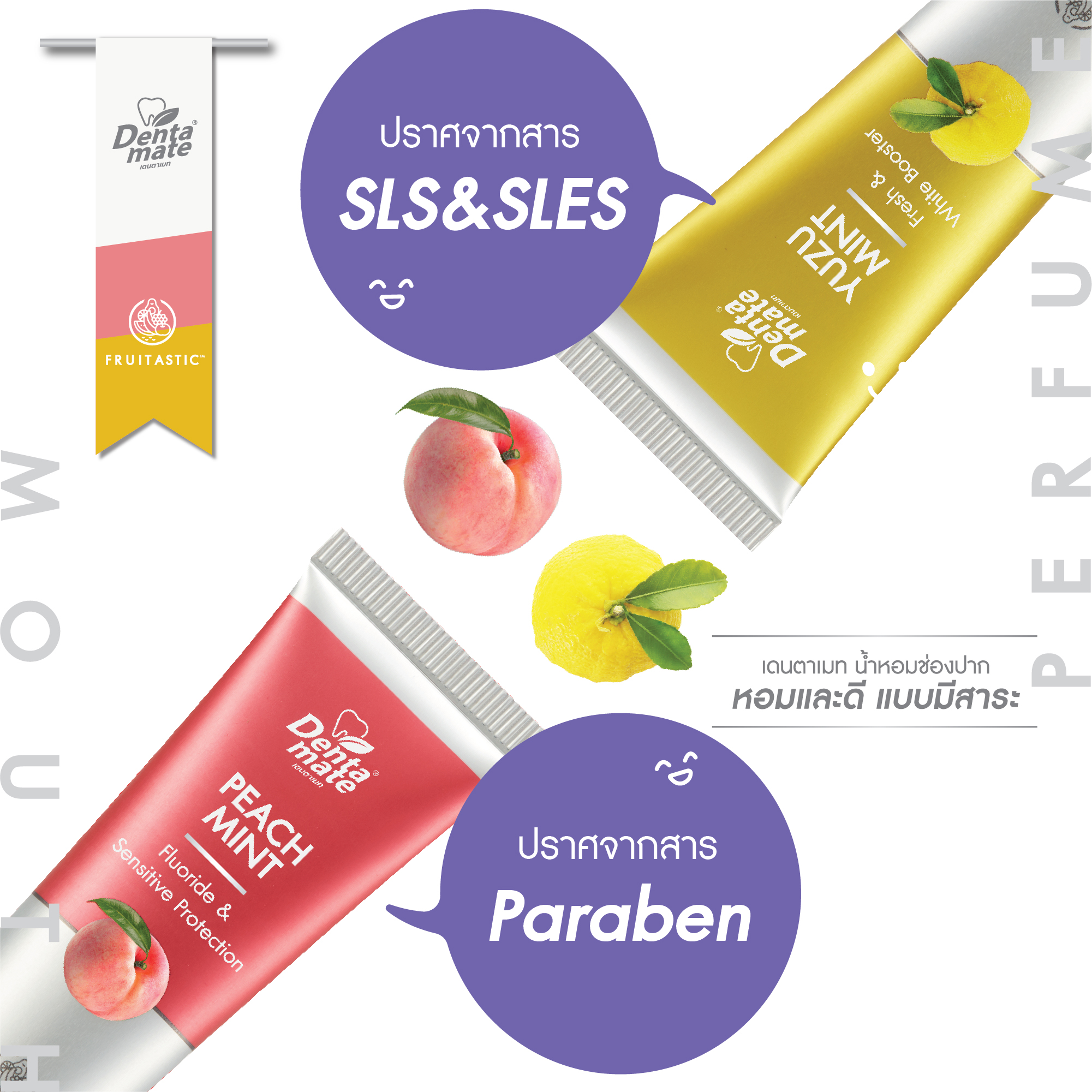 สูตรพีชมินต์ ยูซุมินต์ ใช้เทคโนโลยี Nano Encapsulation ที่กักเก็บความหอมมาใช้กับยาสีฟัน เดนตาเมท สูตร Peach Mint & Yuzu Mint ช่วยให้สัมผัสถึงความหอมสดชื่นได้ยาวนาน